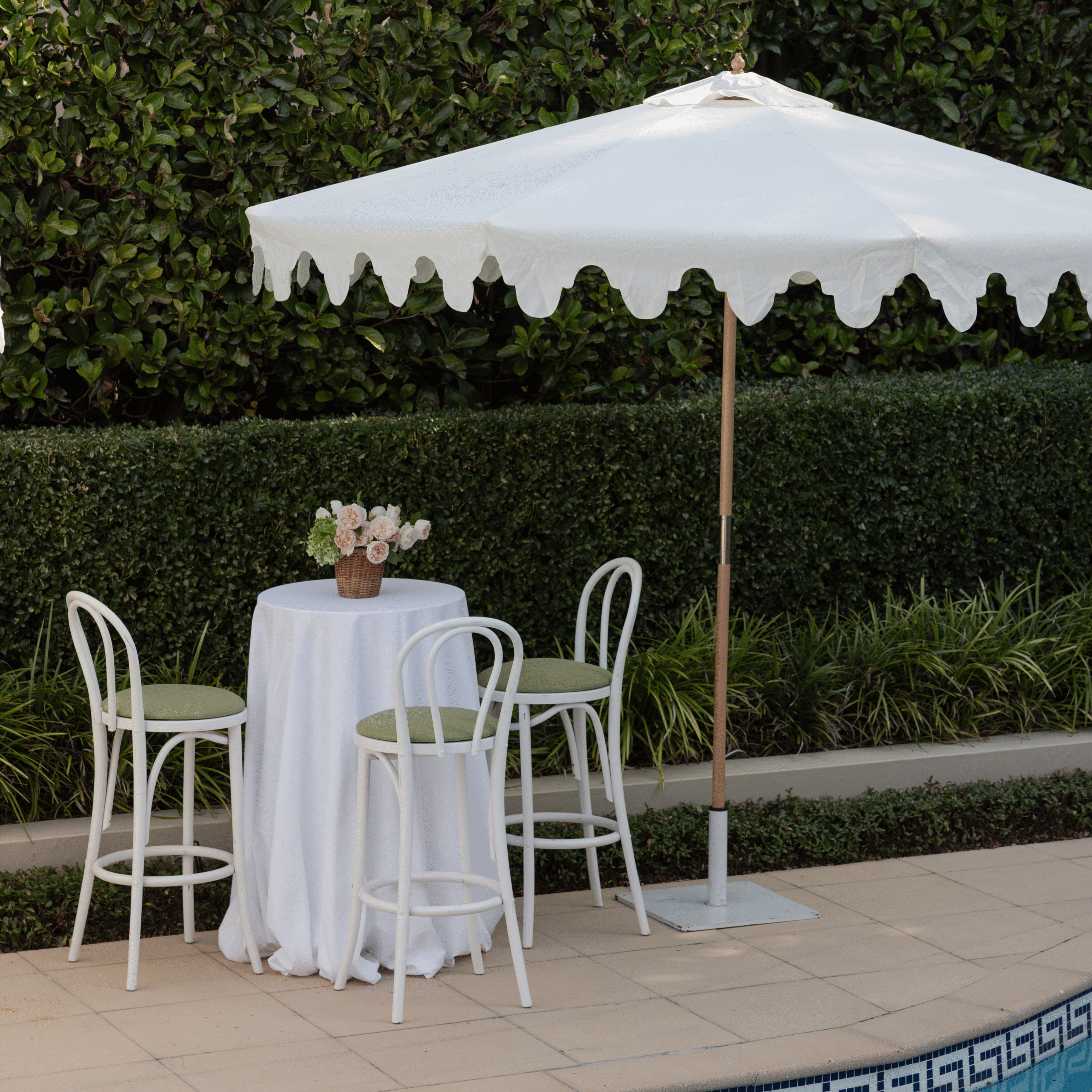 Our Large White Vintage Scallop umbrella is one of our many pieces from our outdoor range. This beautiful white umbrella features a vintage shaped design around the edging of the umbrella and makes a scallop design with the individual flap feature. This umbrella is perfect for so many different occasions from weddings, bridal showers, corporate events or any cocktail event that you want to add a level of beauty to.