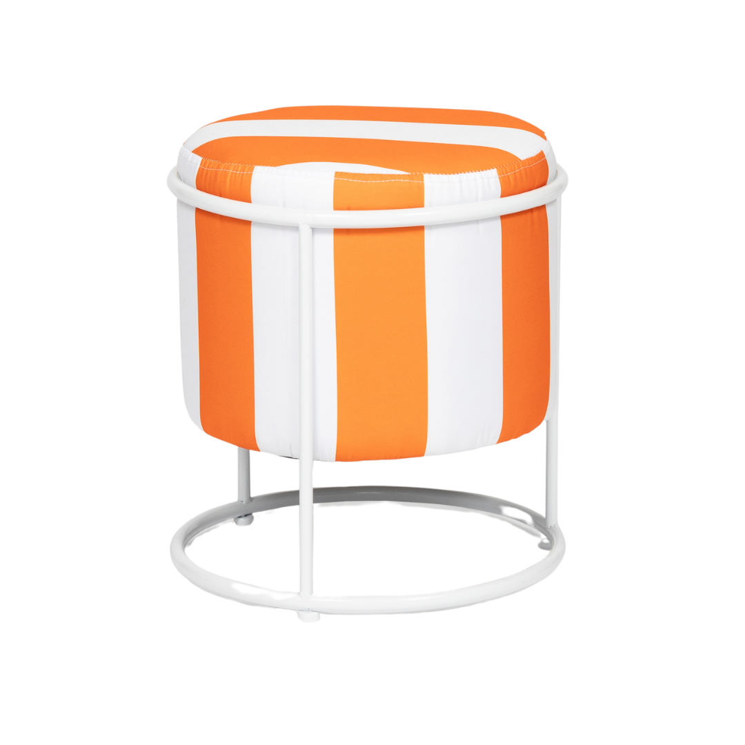 Our Orange Stripe Loop Ottoman is one of our many lounge furniture hire pieces. Our Loop Ottoman features a white slim metal frame with a orange/white stripe padded seat. In our Loop collection we have the matching Sofa, armchair and bar stools. Available to complete your lounge design we have coffee table and side tables available to hire.