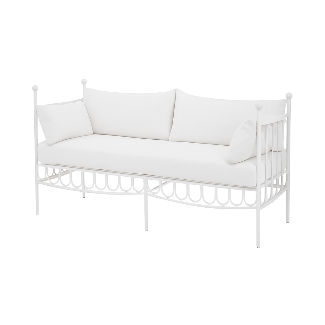 Elevate your event styling with this Mediterranean-inspired sofa, designed with a balance of simplicity and elegance that evokes the charm of Europe’s coastal terraces. Its graceful iron frame features a repeating pattern of arched semicircles along the base, lending both structure and a subtle decorative rhythm. The frame is finished with rounded finials at each corner, adding a refined touch to its silhouette.