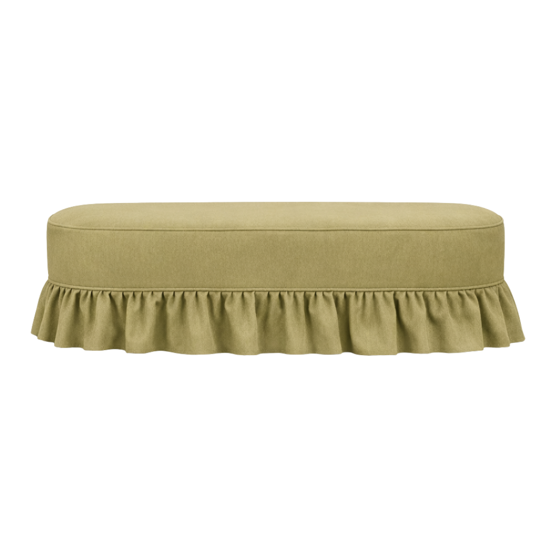 The Green Ruffle Skirt Bench Ottoman is a charming statement piece that combines vintage flair with modern sophistication. Wrapped in an elegant green fabric, its tailored round ends are accentuated by a flowing ruffle skirt – adding a sense of movement and whimsy.