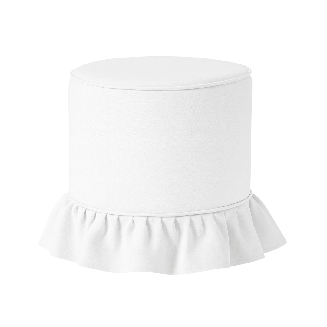 The White Ruffle Skirt Ottoman is a charming statement piece that combines vintage flair with modern sophistication. Wrapped in an elegant white fabric, its tailored cylindrical form is accentuated by a flowing ruffle skirt – adding a sense of movement and whimsy.