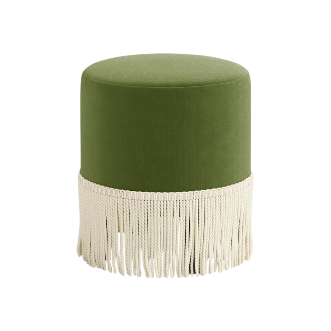 Bring a touch of character and charm to your event with the Green Tassel Ottoman. Wrapped in green fabric and finished with soft cream tassel trim, this piece blends earthy tones with vintage-inspired detailing. The deep green hue adds warmth and richness, while the tassels introduce a playful yet refined texture.
